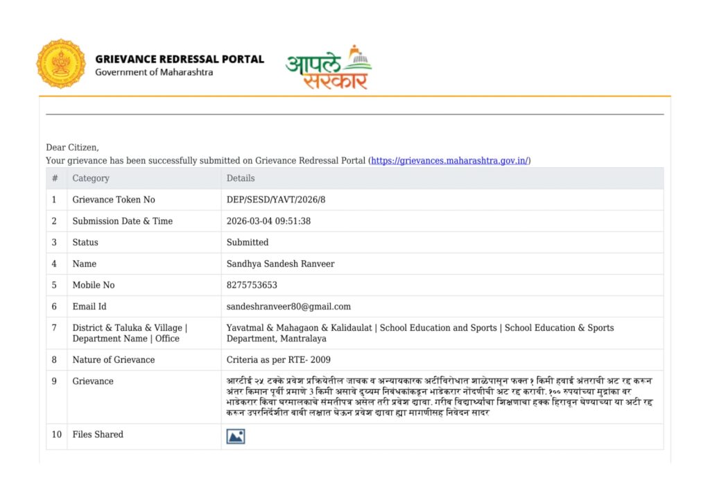 महागांव दि 4 आर टी ई अंतर्गत 25% प्रवेशासाठी यावर्षी नवीन लादलेल्या अटी रद्द करण्यात येऊन विध्यार्थ्यांना सुलभ प्रवेश मिळावा या न्याय मागणीचे निवेदन शिक्षणमंत्री महाराष्ट्र शासन यांना सौं संध्या संदेश रणवीर यांनी पाठवून विद्यार्थी हितार्थ न्याय मागणी केली आहे.आर टी ई 25%अंतर्गत गरीब,गरजू व सर्वसामान्य कुटुंबातील मुलांना शिक्षणाची मोफत प्रवेशाची संधी आहे.यात जाचक अटी टाकण्यात आल्याने अनेक पालकांना अडचणीला सामोरे जावे लागणार आहे यात पूर्वीची 3 किलोमीटर हवाई अंतराची अट काढून 1 किलोमीटर केल्याने अनेक विध्यार्थ्यांना या प्रवेशापासून वंचित राहावे लागणार आहे. शिक्षणाचा हक्क कायद्यात हवाई अंतराचा कुठलाही उल्लेख नसताना ही अट टाकण्यात आली असून हा बेकायदेशीर अन्याय असून ही अट रद्द करावी सोबतच भाडे करार नोंदणी साठी दुय्यम निबंधक कार्यालयाची सक्ती करण्यात आली असून त्याऐवजी केवळ 100 रुपयाच्या भाडेकरार किंवा घरमालकाच्या संमतीवरही प्रवेश द्यावा जेणेकरून विध्यार्थ्यांना प्रवेश प्रक्रियेत सुलभता येईल या दृष्टीने कार्यवाही व्हावी अशी मागणी संध्या रणवीर यांनी निवेदनातून केली आहे.